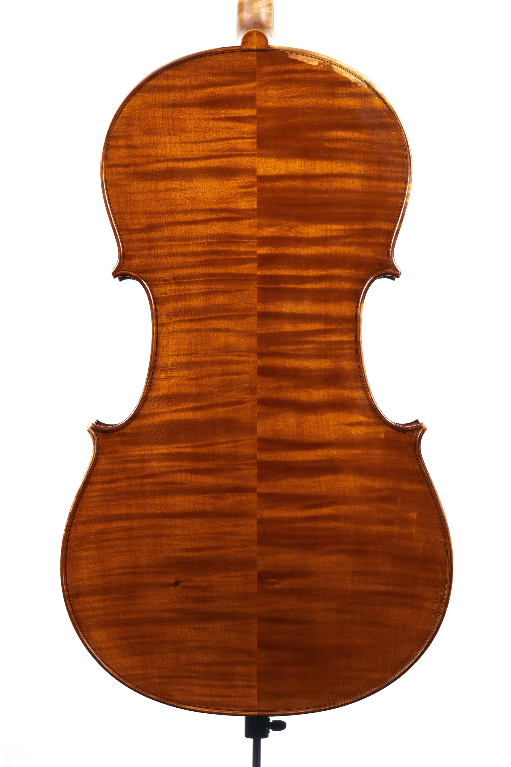 The cello is finished in a refined orange-brown varnish of thin, delicate texture, allowing the materials to speak with clarity and depth. The top is crafted from dense, hard spruce with pronounced winter growth rings, lending structural strength and tonal focus, while the back, ribs, and scroll are made from strikingly flamed maple of slightly irregular pattern, chosen for both beauty and acoustic vitality.