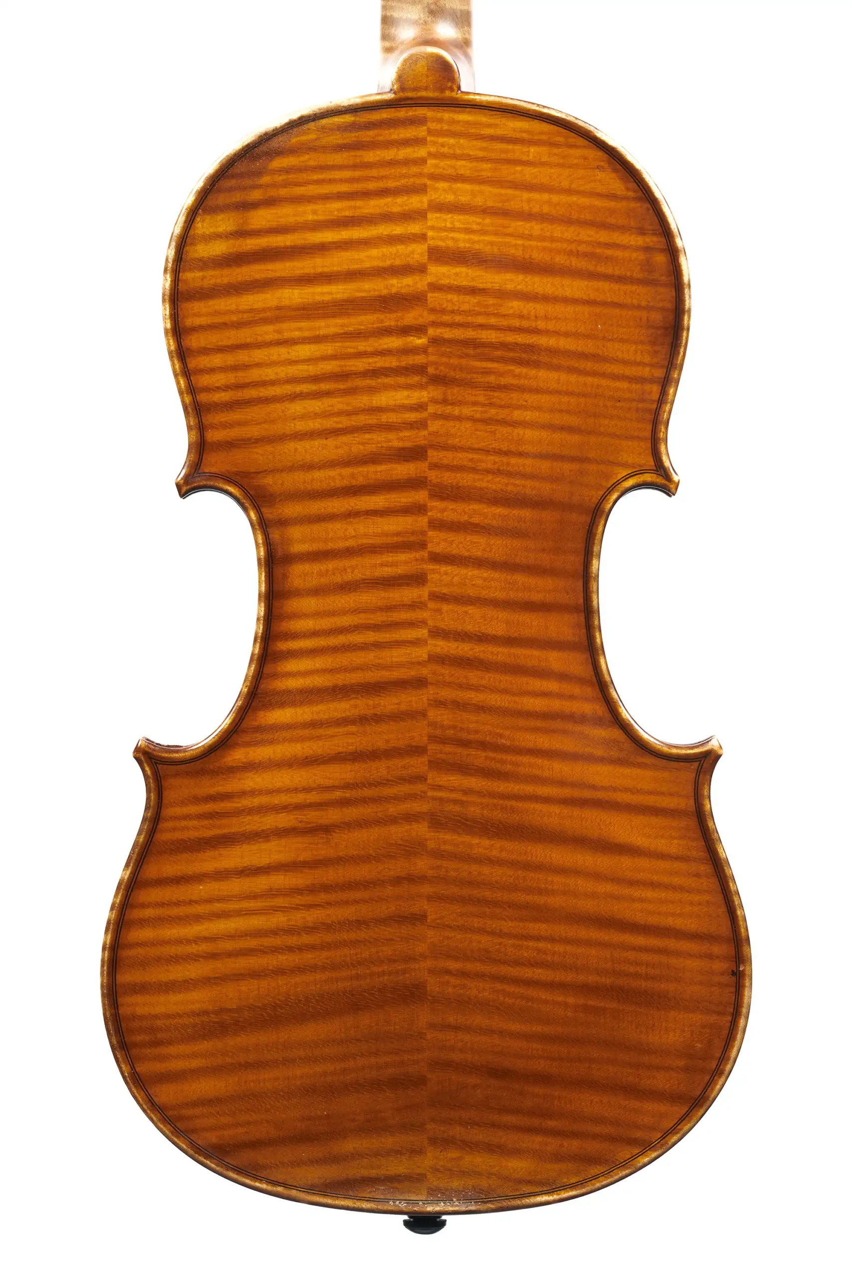 The violin is crafted from excellent materials, with a two-piece back of deeply and evenly flamed maple and a fine-grained spruce top. It is finished in a thin, luminous golden-orange varnish with subtle antiquing, enhancing both transparency and warmth.