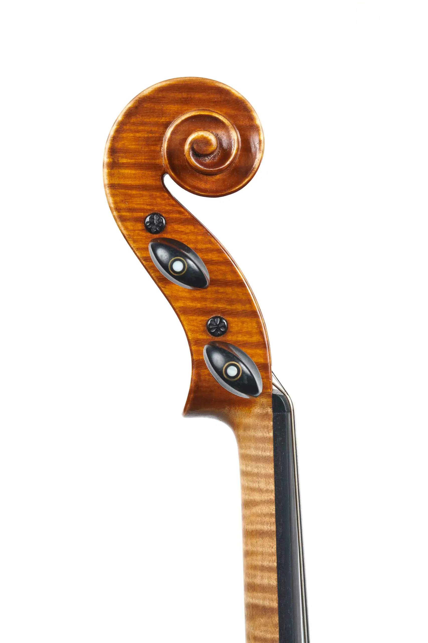 This refined violin by Mario Gadda, made in Mantova in 1982, is a stylistic interpretation of Giuseppe Ornati’s distinguished Milanese model. The instrument features elegant, relatively low arching that supports clarity and projection, while the finely sculpted and tastefully defined edgework closely follows Ornati’s disciplined aesthetic. The scroll and f-holes are likewise inspired by Ornati’s style, executed with precision and harmonious proportion.